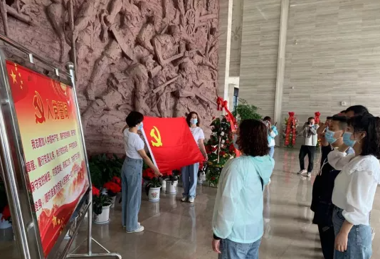 在莊嚴(yán)的紀(jì)念館序廳革命先輩浮雕前,全體黨員干部面對鮮紅的黨旗重溫了入黨誓詞。